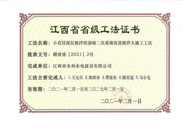 2021年2月1日,江西省住房和城鄉(xiāng)建設(shè)廳文件《關(guān)于公布我省2020年度第二批省級工程建設(shè)工法的通知》(贛建建〔2021〕2號)公布了2021年度第二批省級工程建設(shè)工法評審結(jié)果,其中,公司申報的《小直徑深層攪拌防滲墻二次成墻改進攪拌頭施工工法》、《嵌巖混凝土防滲墻液壓抓斗純抓發(fā)造槽施工工法》審定為“2020年度省級工程建設(shè)工法”。