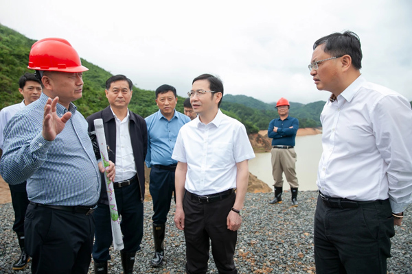 2021年5月21日上午,鷹潭市委書記黃喜忠深入由我集團承建的貴溪市塘灣水庫除險加固工程進行實地調研,指導在建工程防汛備汛。塘灣水庫壩址以上控制流域面積22.6平方公里,總庫容1321萬立方米,灌溉面積1.43萬畝,電站裝機容量320千瓦。塘灣水庫除險加固工程于2020年11月開工建設,目前在各參建單位共同努力下,按計劃穩步推進,主體工程有望在合同工期內完工。黃喜忠登上水庫大壩,實地查看了項目建設進展情況,并對水庫加固工程建設工作提出明確要求。他指出,要在確保質量和安全的前提下,加快推進項目建設,確保早日建成見效。黃書記強調,各參見單位在工作中要堅持人民至上、生命至上,切實把確保人民生命安全放在第一位落實。