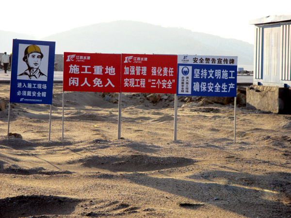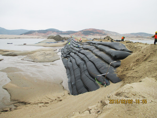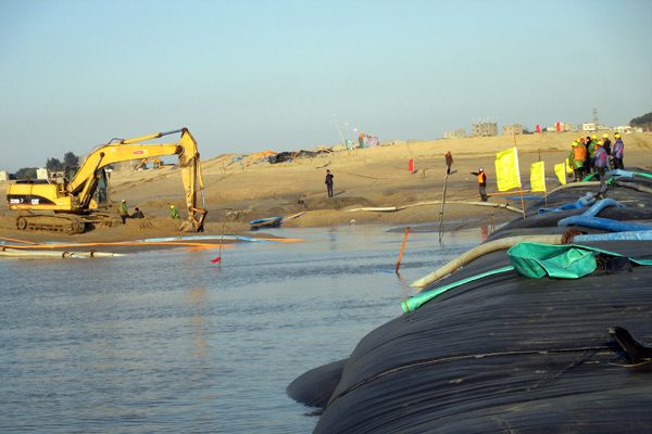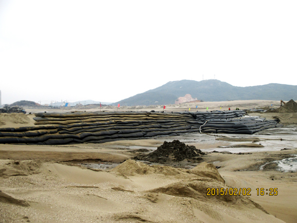 平潭綜合實驗區(qū),主島為海壇島,位于福建省東部,與臺灣隔海相望,是中國大陸距離臺灣島最近的地方,是中國第五大島,有福建的“馬爾代夫”之稱。平潭綜合實驗區(qū)如意湖防潮閘工程項目總投資1.3億元,我公司承建的土建工程包括排澇閘、防潮閘、公路橋、上下游兩岸翼墻、防沖消能、控制房等土建工程施工(含導(dǎo)流明渠開挖、圍堰填筑)。平潭(簡稱嵐)年平均風(fēng)速超過五級以上,大風(fēng)呼嘯,沒來這里感受不到風(fēng)有多大!依據(jù)工程設(shè)計及進度要求,在落差8m潮汐中的軟基上進行圍堰模袋充砂以截流海水,在惡劣地質(zhì)條件的海中建閘,與潮水賽跑、跟臺風(fēng)搶工期,潮起潮落,給工程建設(shè)平添了許多艱難與艱辛。