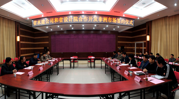 2013年11月13日,我公司與江西省水利規劃設計院合作開發非洲市場暨聯合成立“江西省水利規劃設計院埃塞俄比亞分院”簽約儀式在省水院會議中心舉行。江西省水利廳黨委書記、廳長孫曉山出席簽約儀式并作重要講話,我公司董事長兼總經理王元旦、省水院院長孔俐麗分別致辭,并代表雙方簽訂戰略合作協議。