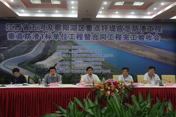 2011年5月8日,我公司承建的江西省五河及鄱陽湖區(qū)重點圩堤應急防滲處理工程垂直防滲1標單位工程暨合同工程完工驗收會在南昌市召開。省水利廳廳長孫曉山,廳紀委書記李東江,副廳長文林、廳總工張文捷,省發(fā)改委、省財政廳、省水利廳有關處室及有關單位負責人,南昌市水利局等領導出席了會議。